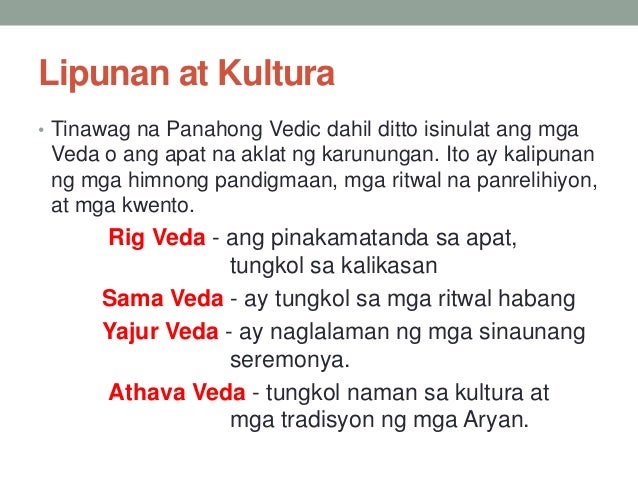 Ito ay hango sa apat na sagradong aklat Rig Veda Sama Veda Yajur Veda at Arthava Veda. Edison2 edison2 12092016 Araling Panlipunan Junior High School 5 pts. Tinawag ding Panahong Vedic ang panahong ito.
